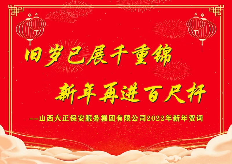 2022年是黨的二十大勝利召開(kāi)之年,也是大正保安集團(tuán)改革發(fā)展歷程中極為關(guān)鍵的一年。誠(chéng)摯希望全體大正保安人能夠一如既往地用付出和堅(jiān)守詮釋大正保安集團(tuán)的責(zé)任和擔(dān)當(dāng),也誠(chéng)摯希望各界朋友能夠一如既往地關(guān)心和支持大正保安集團(tuán)的建設(shè)和發(fā)展,讓我們攜手同行、守望相助,守正篤實(shí)、久久為功,加快建設(shè)國(guó)內(nèi)一流的綜合型保安服務(wù)集團(tuán),努力在忻州全方位推動(dòng)高質(zhì)量發(fā)展、奮力譜寫全面建設(shè)社會(huì)主義現(xiàn)代化國(guó)家忻州篇章的新征程中再創(chuàng)佳績(jī),以優(yōu)異成績(jī)迎接黨的二十大勝利召開(kāi)!
