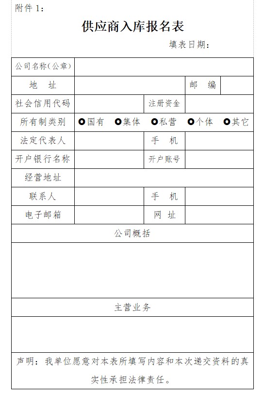 為滿足采購工作需求,現(xiàn)公開征集符合本公司采購條件的供應商加入公司“供應商數(shù)據(jù)庫”,歡迎符合資質(zhì)的供應商參加報名。