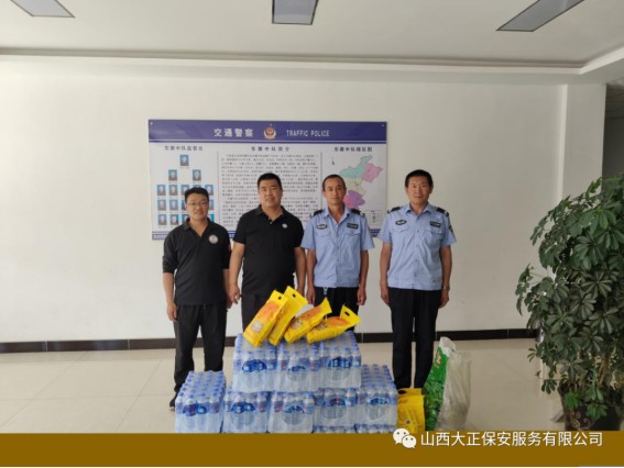 6月4日上午,山西大正保安服務(wù)(集團)有限公司守押三公司經(jīng)理張利榮攜繁峙中隊中隊長劉光、副隊長李宏飛、何英來到繁峙縣交警大隊,代表公司為工作在一線的交通民警們送上了防暑慰問品。對他們頂烈日、冒高溫堅守崗位的敬業(yè)精神表示由衷的敬意。張利榮經(jīng)理表示:隨著夏季的到來,執(zhí)勤交警在炎熱天氣下辛苦工作,為轄區(qū)道路的暢通和廣大市民的安全出行付出了辛勤的汗水,交警同志們的這種不怕苦、不怕累的敬業(yè)精神值得廣大群眾尊敬和學(xué)習(xí)。作為服務(wù)從業(yè)者的我們自身更應(yīng)該擔(dān)當(dāng)社會責(zé)任,嚴(yán)格遵守各項交通法規(guī)。繼續(xù)做好警企共建活動,切實做遵守交通法規(guī)的踐行者。交警大隊負責(zé)人對企業(yè)的愛心慰問表示感謝,并指出將會更加盡心盡力做好本職工作,以實際行動為群眾服務(wù)。同時,也希望廣大群眾理解、支持交警的工作,自覺遵守交通法規(guī),文明、守法出行。